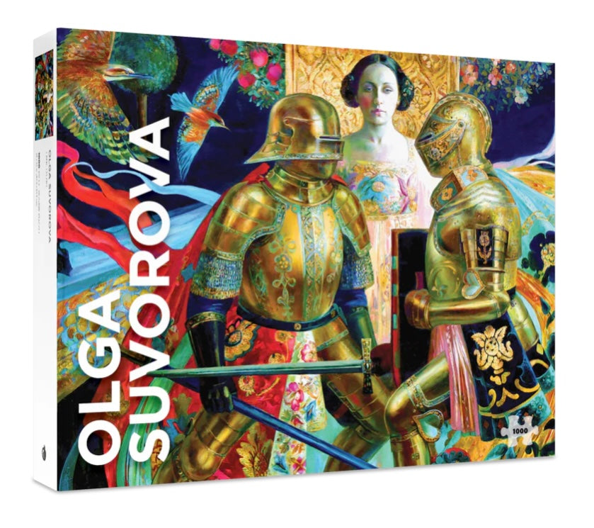 Knights in embellished armor face off in The Duel, their battle energy contrasting with the enigmatic gaze of the woman behind them. Olga Suvorova’s lavish scene hints at a dramatic tale and is depicted in her signature style influenced by the Pre-Raphaelites, Gustav Klimt, and traditional Russian icons. Suvorova, who comes from a three-generation dynasty of artists, studied monumental composition at the St. Petersburg Academy of Fine Arts. She is known for her portraiture, both at home in Russia and around the world.